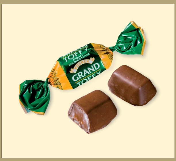 Глазированные шоколадной глазурью конфеты, корпус – масса тоффи с добавлением шоколадной пасты с ароматом ореха